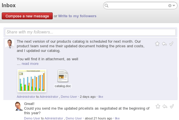 En Odoo, desarrollamos herramientas para implantar la productividad en las empresas. Como los correos electrónicos y los flujos de información suponen algunas de las mayores pérdidas de tiempo en las empresas, debemos encontrar una solución a esto.